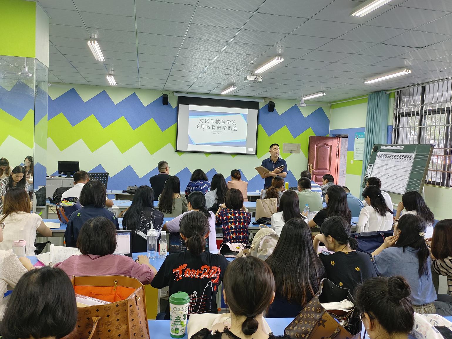 9月19日下午,文化与教育学院在三教声乐室召开了9月教育教学工作会议,本次会议由学院党总支书记邓毅主持,学院执行院长史正刚、副院长史海静、张维及全院教职工参加。