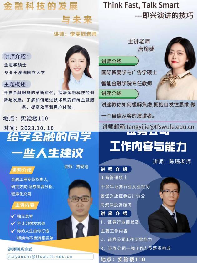 为帮助金融学子扩大知识面,了解更多专业领域知识与行业前沿动态,引导和激励学生永葆奋斗姿态、砥砺前行,智能金融学院于9月至10月举办了4期(第31期至第34期)鑫览讲坛,主题分别为“即兴演讲的技巧”“给学金融的同学一些人生建议”“金融科技的发展与未来”“证券公司工作内容与能力”。