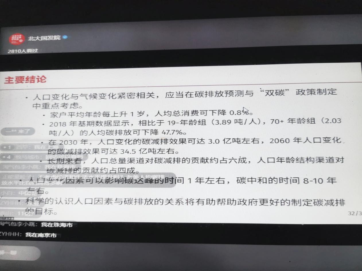 学生在听取讲座的过程中,通过线上向赵波老师提问了经济因素对碳排放的影响机制,以及未来50年中国碳排放将面临什么样的形势。