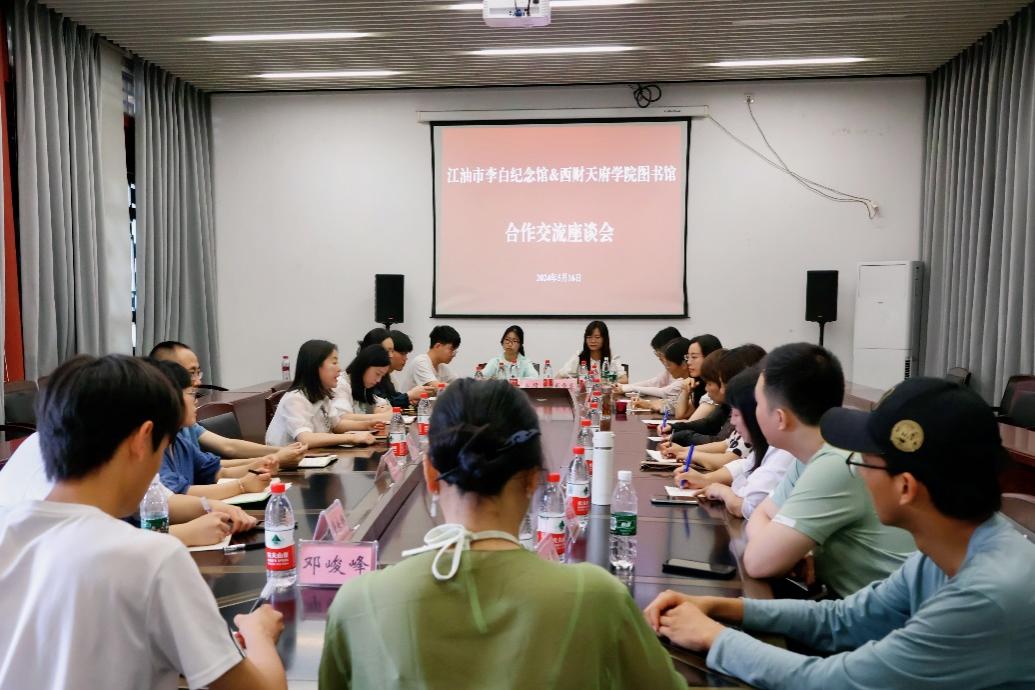 参观学习后,双方在李白纪念馆兰苑会议室进行了座谈交流。会上,陈安薇介绍了纪念馆的基本情况和后续发展计划;武同雁从图书馆资源数字化的共建共享、李白文化选修课程开设、教材编写等方面做了介绍;沈德存结合四川传统文化研究中心工作对后续计划合作开展的科研课题申报、李白书画展等方面进行了沟通;柳青就基于知识图谱、大模型、RAG检索增强的传统文化项目思路进行了分享;学生科研助理和创新班的同学也分别根据自己的专业方向分享了对李白文化传承普及的结合点、创新点的见解。