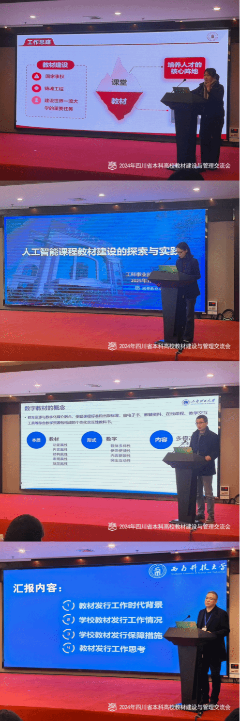 会议下半场,成都理工大学地球与行星科学学院副教授徐冠立、西南科技大学教务处副处长张庆明依次分享了题为“人工智能通识课教材建设探索”“数字教材建设案例分享”“西南科技大学教材征订管理经验”的专题报告。