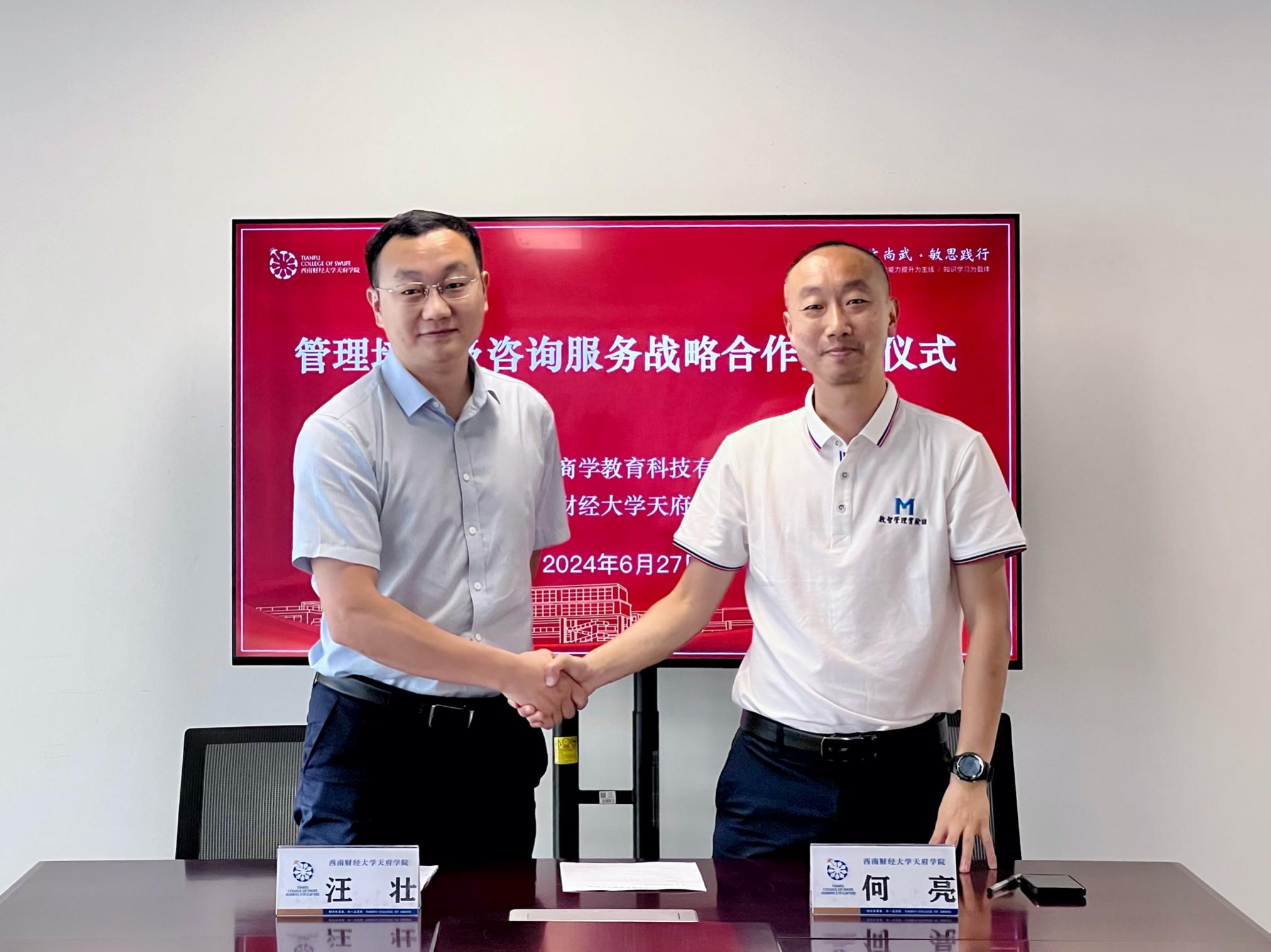 6月27日,西南财经大学天府学院与四川聚点商学教育科技有限公司在创新中心411会议室顺利举行管理培训及咨询服务战略合作协议签约仪式。此次合作标志着双方将在教育资源整合、管理培训及企业咨询服务领域展开深度合作,共同探索校企合作新路径。企联秘书长靳清泉,企联咨询培训中心主任、聚点商学总经理汪壮,聚点商学项目经理章小波,以及现代服务管理学院副院长何亮,教师王俐丹和牟文浩老师等出席了本次会议,共同见证了这一...
