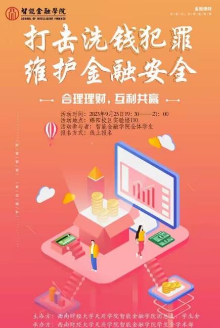 为扩大反洗钱宣传的影响力和辐射面,加强金融学子对洗钱犯罪的防范意识和金融安全意识,9月25日,智能金融学院团总支、学生会学术部在绵阳校区实验楼110室开展了“打击洗钱犯罪,维护金融安全”宣传讲座。本次讲座由国海证券的梁双梅主持,英大证券绵阳部合规风控经理韩军主讲。活动海报此次活动通过线上、线下相结合形式开展。讲座伊始,韩军通过引入真实的洗钱案例,为同学们介绍了洗钱、反洗钱的基础知识,讲解了“跑分”的...