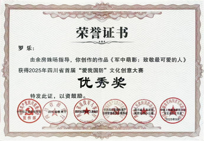 近日,由中共四川省委宣传部、省教育厅、省退役军人事务厅、省国资委、省国动办、省军区政治工作局联合主办的四川省首届 “爱我国防” 文化创意大赛评选结果正式揭晓。天府学子罗乐创作的《军中萌影:致敬最可爱的人》(余房姝旸指导),从 18379 件参赛作品中脱颖而出,荣获数媒创意类学生组优秀奖。获奖证书为备战此次赛事,学校积极组织动员,通过院系宣讲、社团联动鼓励学生参与,并安排专业教师对参赛作品进行多轮指导打磨。此次获奖不仅提升了学生的专业技能与创新实践能力,...